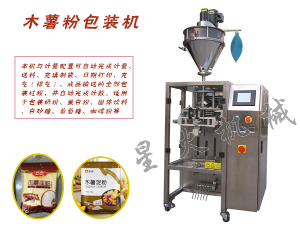 木薯粉是一种淀粉的名称,又称泰国生粉。是一种热带植物的块根中提取的淀粉,木薯粉品质优良,可供食用,或工业上制作酒精、果糖、葡萄糖等。它是婴儿食品牛奶布丁的主要成分,也用来使汤汁及炖菜变稠。木薯淀粉无异味,适用于需精调气味的产品。鉴于木薯粉的应用, 木薯粉自动包装机也在包装界迅速的打开了市场。